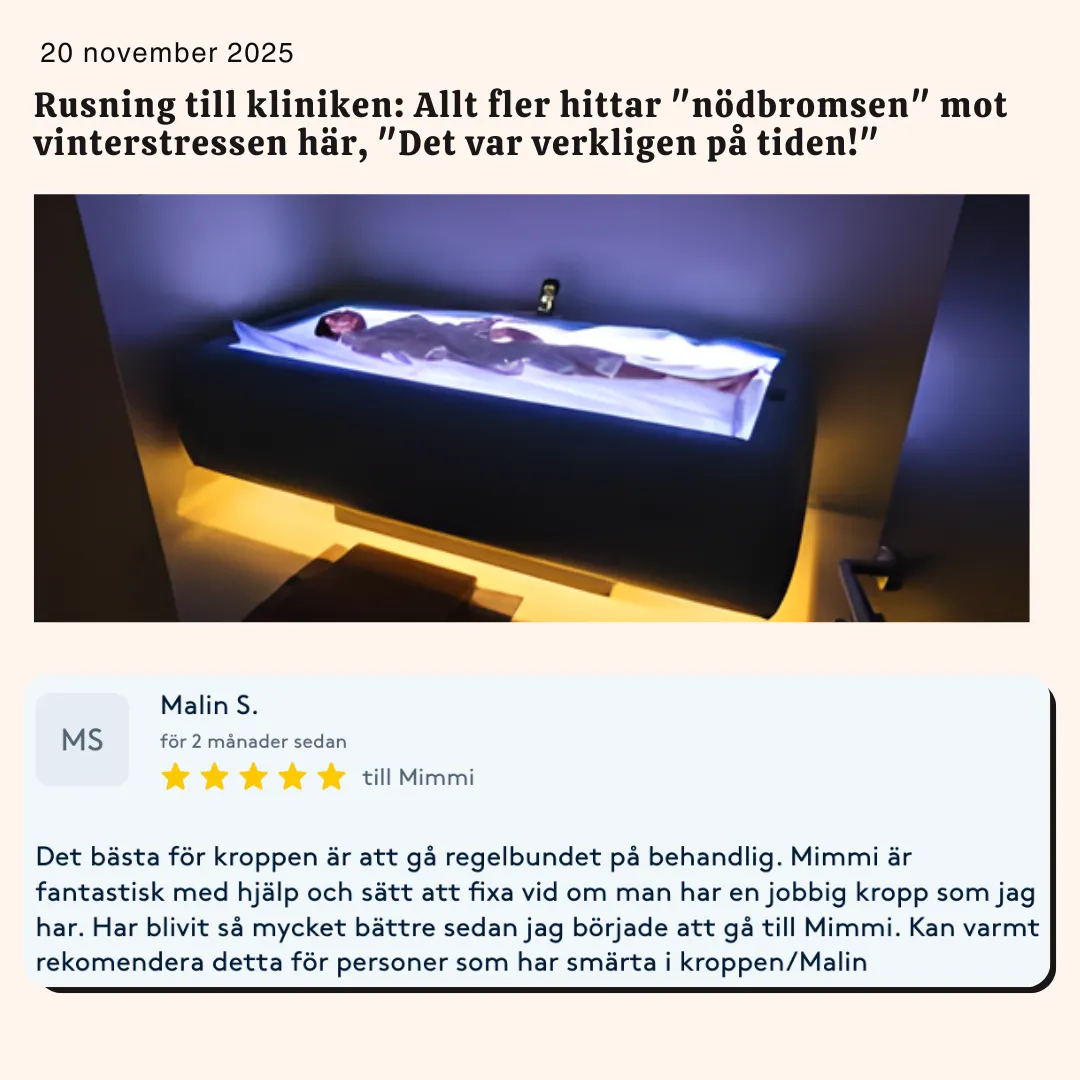 Omedelbar återhämtning – du lämnar kliniken med sänkta axlar, skärpt fokus och ny energi för att klara vintern.