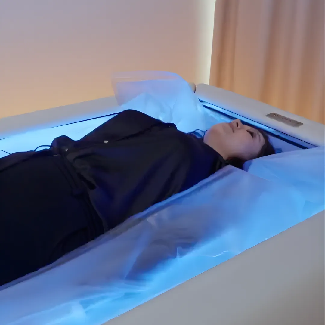 Uppvärmd omslutning utan vatten – du ligger varmt och torrt medan membranet mjukar upp stela muskler och leder.
